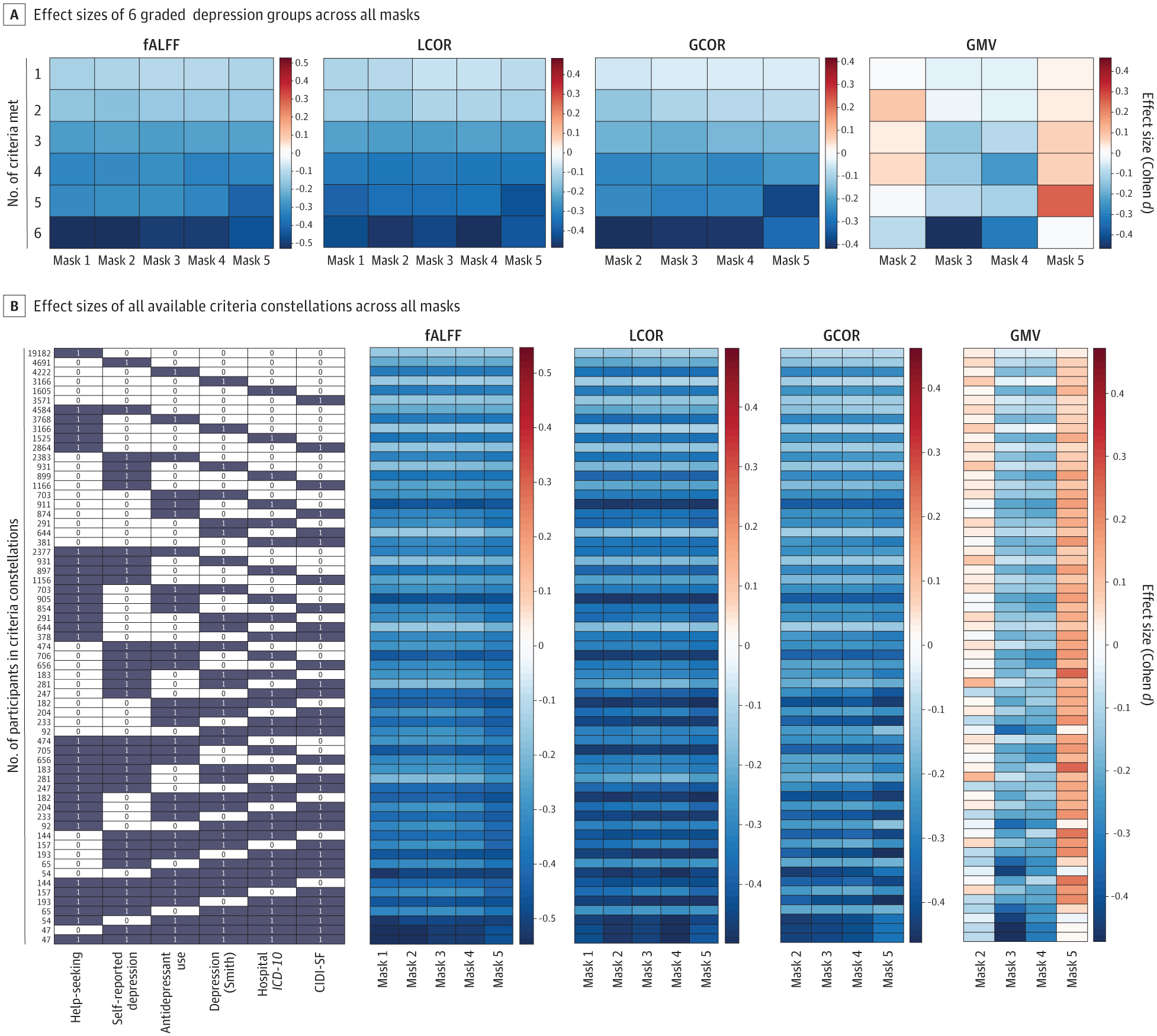 A, Masks indicate the number of criteria met (eg, mask 1 indicates meeting 1 criterion; mask 5, meeting 5 criteria). Effect sizes were calculated in all depression stratum–mask pairs. B, The dark element indicates that the column contains corresponding criteria. Other blocks show the effect size values (Cohen d). Red indicates increased imaging measures in depression group, and blue indicates reduced imaging measures in depression group. CIDI-SF indicates Composite International Diagnostic Interview Short Form; fALFF, fractional amplitude of low-frequency fluctuations; GCOR, global correlation; GMV, gray matter volume; ICD-10, International Statistical Classification of Diseases and Related Health Problems, Tenth Revision; LCOR, local correlation.