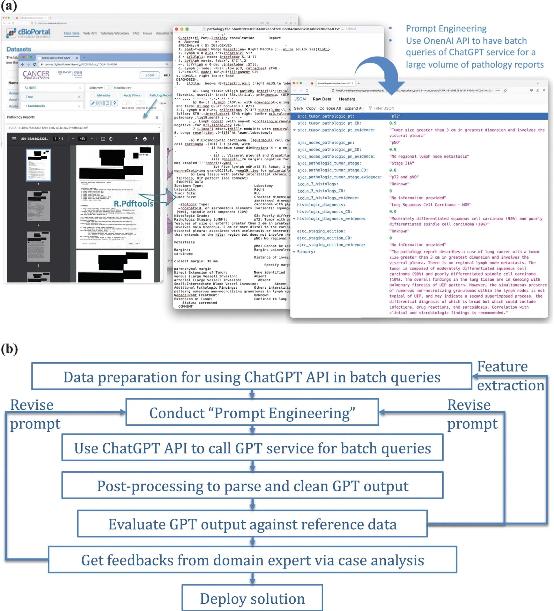 A total of 1,026 lung tumor pathology reports and 191 pediatric osteosarcoma reports from the Cancer Digital Slide Archive (CDSA), which served as the training set, as well as the Cancer Genome Atlas (TCGA), which served as the testing set, were transformed to text using R program. Text data was subsequently analyzed using the OpenAI API, which extracted structured data based on specific prompts.