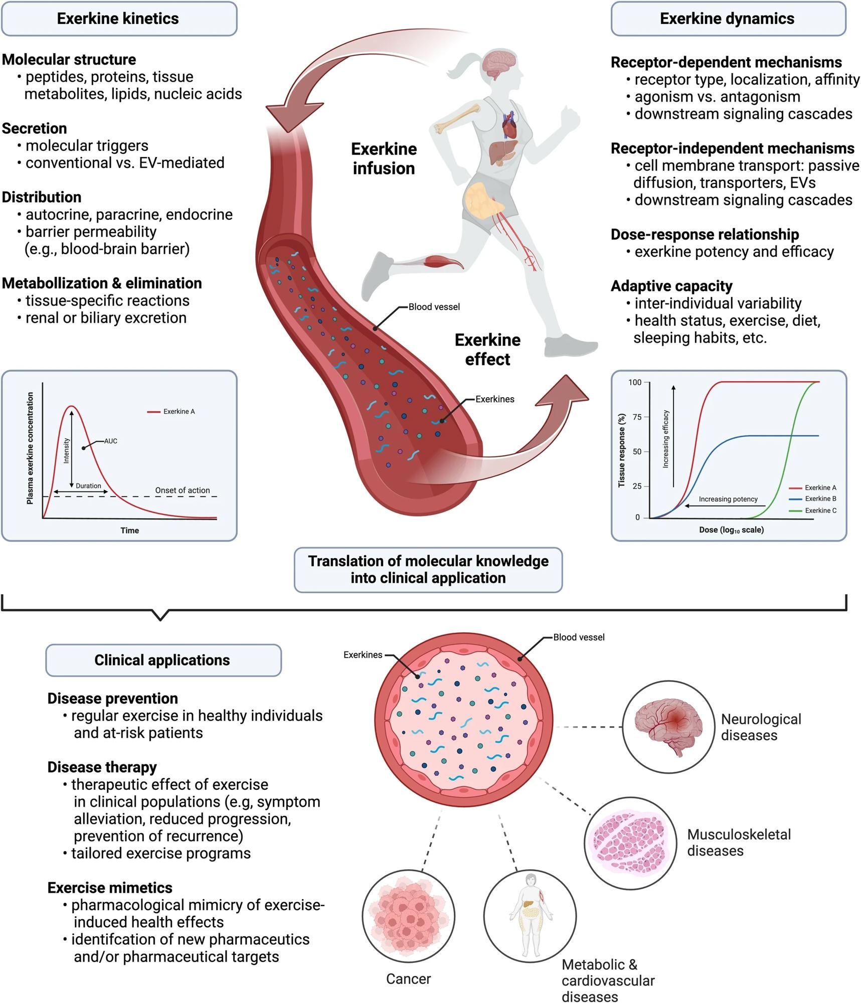 Molecular exercise therapy: mode of action and clinical implications of exercise-induced signaling molecules (exerkines). The effect of exerkines on the human organism can broadly be divided into exerkine kinetics and exerkine dynamics. During acute exercise, numerous exerkines are secreted in an autocrine, paracrine and/or endocrine manner. In the case of endocrine secretion, these exerkines are distributed throughout the human organisms, making them available to distinct target tissues. The intensity and duration of an exerkine effect is dictated by the exerkine concentration over time (area under the curve, AUC), which, in case of endocrine secretion, can be quantified as plasma exerkine levels. For autocrine and paracrine secretion, microdialysis or other techniques for isolation of extracellular fluids allow precise quantification of tissue-specific exerkine concentrations and determination of exerkine concentration-time curves. Of note, exerkines might also be subject to metabolization and elimination via distinct routes. Once exerkines are secreted, they interact with target cells in a receptor-dependent or receptor-independent manner. For receptor-dependent interactions, the effect on target cells depends on the precise characteristics of the target receptor and the exerkine–receptor interaction. The intrinsic activity of an exerkine (agonism vs. antagonism), its affinity to the target receptor, and the receptor density on target cells dictate dose-response relationships for exerkine-exerkine receptor pairs that determine the potency and efficacy of an exerkine. For receptor-independent mechanisms, passive diffusion across the cell membrane, transmembrane transporters, and extracellular vesicle (EV)-mediated uptake of exerkines have been described. Once exerkines have entered the intracellular space, they can trigger signal transduction and subsequent adaption processes in a distinct fashion. These molecular characteristics as well as inter-individual differences in health status and lifestyle habits (e.g., diet, exercise, sleeping behavior) determine the magnitude of tissue adaption. Transferring mechanistic knowledge on exerkine kinetics and exerkine dynamics into disease context has promising clinical implications, e.g., in disease prevention, targeted exercise therapy and the development of novel, exercise-inspired pharmaceutics (i.e., exercise mimetics). Created with BioRender.com