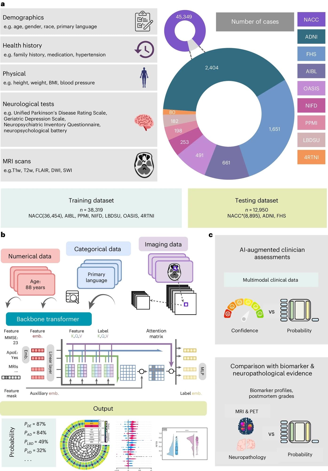 a, Our model for differential dementia diagnosis was developed using diverse data modalities, including individual-level demographics, health history, neurological testing, physical/neurological exams and multisequence MRI scans. These data sources whenever available were aggregated from nine independent cohorts: 4RTNI, ADNI, AIBL, FHS, LBDSU, NACC, NIFD, OASIS and PPMI (Tables 1 and S1). For model training, we merged data from NACC, AIBL, PPMI, NIFD, LBDSU, OASIS and 4RTNI. We used a subset of the NACC dataset for internal testing. For external validation, we utilized the ADNI and FHS cohorts. b, A transformer served as the scaffold for the model. Each feature was processed into a fixed-length vector using a modality-specific embedding (emb.) strategy and fed into the transformer as input. A linear layer was used to connect the transformer with the output prediction layer. c, A subset of the NACC testing dataset was randomly chosen to conduct a comparative analysis between neurologists' performance augmented with the AI model and their performance without AI assistance. Similarly, we carried out comparative evaluations with practicing neuroradiologists, who were provided with a randomly selected sample of confirmed dementia cases from the NACC testing cohort, to assess the impact of AI augmentation on their diagnostic performance. For both these evaluations, the model and clinicians had access to the same set of multimodal data. Finally, we assessed the model’s predictions by comparing them with biomarker profiles and pathology grades available from the NACC, ADNI and FHS cohorts.