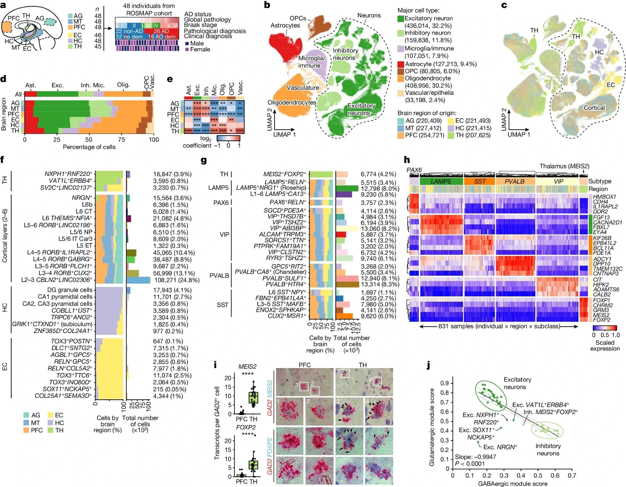 a, snRNA-seq profiling summary, covering 283 samples across 6 brain regions from 48 participants from ROSMAP, showing global pathology, Braak stage and pathological (26 AD and 22 non-AD) or clinical diagnosis of AD (16 AD dementia (dem.) and 32 no dementia). b,c, Joint uniform manifold approximation and projection (UMAP), colored by major cell type (b) and region of origin (c). d, The regional composition of major cell types. e, Relative enrichment of major cell types across regions by quasi-binomial regression. False discovery rate (FDR)-corrected P values are indicated by asterisks; ***P < 0.001, **P < 0.01, *P < 0.05. f,g, Global breakdown, region composition, enrichment and number of nuclei for excitatory (f) and inhibitory (g) neuronal subtypes. h, Gene expression analysis of the top four markers per inhibitory subclass, averaged at the sample by subclass level (columns). i, RNAscope validation of FOXP2 and MEIS2 as markers of the unique thalamus subtype, with quantification (left) performed using Student’s t-tests and representative images (right). The blue puncta represent MEIS2 (top) or FOXP2 (bottom) transcripts and red puncta represent GAD2 transcripts. FOXP2: n = 19 (PFC) and n = 22 (TH) cells; MEIS2: n = 35 (PFC) and n = 26 (TH) cells; each dot represents an individual cell, pooled from eight samples (four individuals; each had one PFC and one thalamus sample). j, Glutamatergic versus GABAergic scores for all neuron subtypes. The dotted lines represent the 95% confidence interval around the linear fit. P values were calculated using two-sided F tests. Ast., astroa, snRNA-seq profiling summary, covering 283 samples across 6 brain regions from 48 participants from ROSMAP, showing global pathology, Braak stage and pathological (26 AD and 22 non-AD) or clinical diagnosis of AD (16 AD dementia (dem.) and 32 no dementia). b,c, Joint uniform manifold approximation and projection (UMAP), colored by major cell type (b) and region of origin (c). d, The regional composition of major cell types. e, Relative enrichment of major cell types across regions by quasi-binomial regression. False discovery rate (FDR)-corrected P values are indicated by asterisks; ***P < 0.001, **P < 0.01, *P < 0.05. f,g, Global breakdown, region composition, enrichment and number of nuclei for excitatory (f) and inhibitory (g) neuronal subtypes. h, Gene expression analysis of the top four markers per inhibitory subclass, averaged at the sample by subclass level (columns). i, RNAscope validation of FOXP2 and MEIS2 as markers of the unique thalamus subtype, with quantification (left) performed using Student’s t-tests and representative images (right). The blue puncta represent MEIS2 (top) or FOXP2 (bottom) transcripts and red puncta represent GAD2 transcripts. FOXP2: n = 19 (PFC) and n = 22 (TH) cells; MEIS2: n = 35 (PFC) and n = 26 (TH) cells; each dot represents an individual cell, pooled from eight samples (four individuals; each had one PFC and one thalamus sample). j, Glutamatergic versus GABAergic scores for all neuron subtypes. The dotted lines represent the 95% confidence interval around the linear fit. P values were calculated using two-sided F tests. Ast., astrocytes; exc., excitatory neurons; inh., inhibitory neurons; mic., microglia/immune cells; olig., oligodendrocytes; vasc., vascular/epithelial cells.