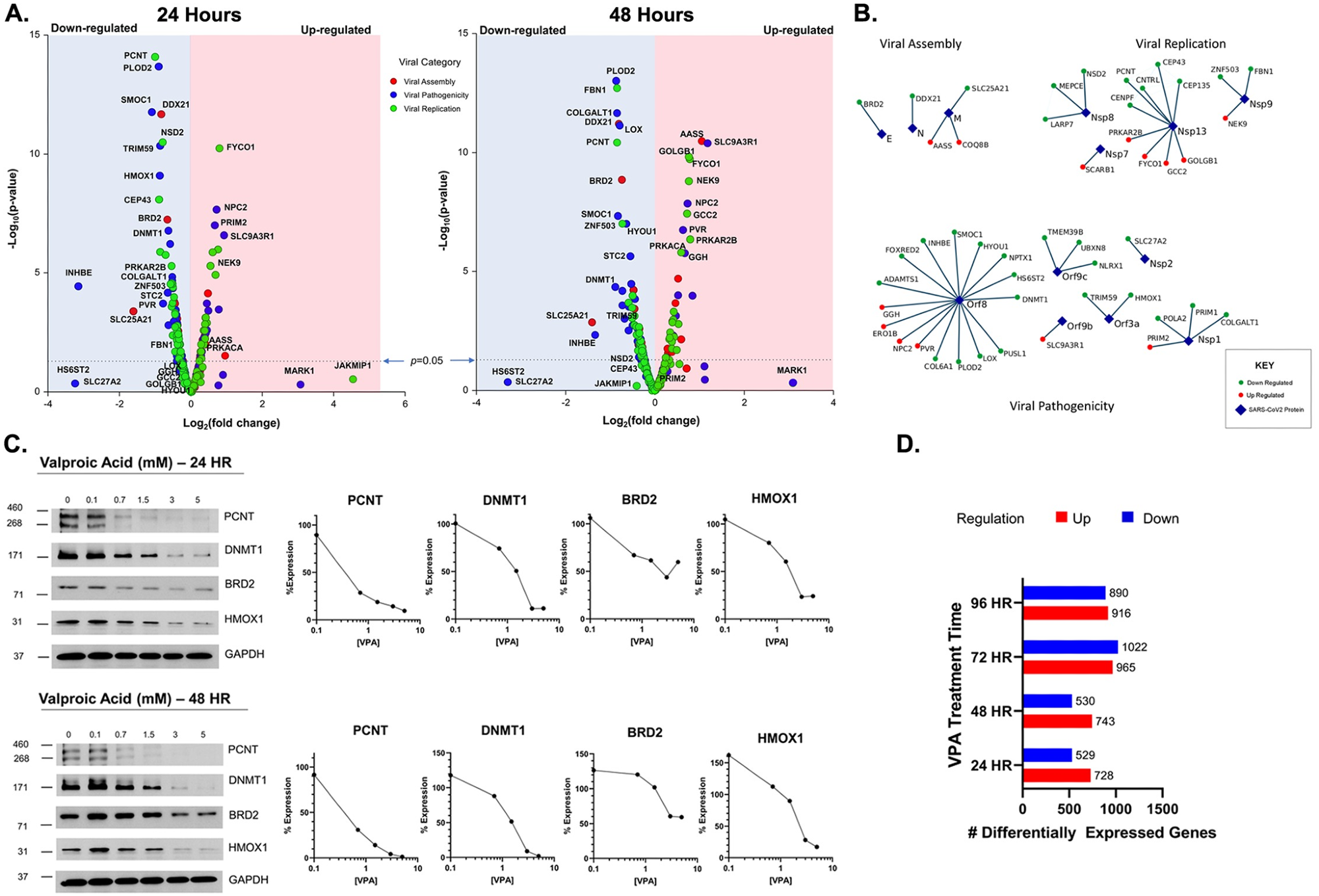 Host cellular genes interactions with the SARS-CoV2 proteins. (A.): Volcano plot for gene expression levels of selected 300 Gordon gene setat 24 hours (left) and 48 hours (right). (B.): Virus-host protein interaction map of the Gordon gene sets that met significance criteria for Viral Assembly, replication and pathogenicity. (C.) Protein levels measured by western blot for selected gene sets PCNT, DNMT1, BRD2, and HMOX1 at 24 hours (top) and 48 hours (bottom). (D.) Differentially expressed genes upon VPA treatment for 24, 48, 72 and 96 hours.Host cellular genes interactions with the SARS-CoV2 proteins. (A.): Volcano plot for gene expression levels of selected 300 Gordon gene setat 24 hours (left) and 48 hours (right). (B.): Virus-host protein interaction map of the Gordon gene sets that met significance criteria for Viral Assembly, replication and pathogenicity. (C.) Protein levels measured by western blot for selected gene sets PCNT, DNMT1, BRD2, and HMOX1 at 24 hours (top) and 48 hours (bottom). (D.) Differentially expressed genes upon VPA treatment for 24, 48, 72 and 96 hours.