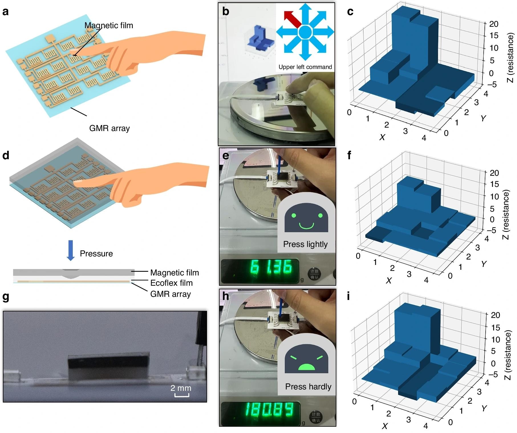 a Schematic image showing the touchless interactions using the flexible GMR sensor array. b Optical image of the flexible GMR sensor array and magnetic skin on a human fingertip. c Magnetic response of the GMR sensor array when a finger approaches the top left corner. d Schematic images showing the pressure sensing using the flexible GMR sensor array. e, h Optical images of the flexible GMR sensor array and magnetic skin when pressures of 61.36 g and 180.89 g are applied. g Optical side images of the pressure sensing installation. f, i Magnetic response when pressures of 61.36 g and 180.89 g are applied