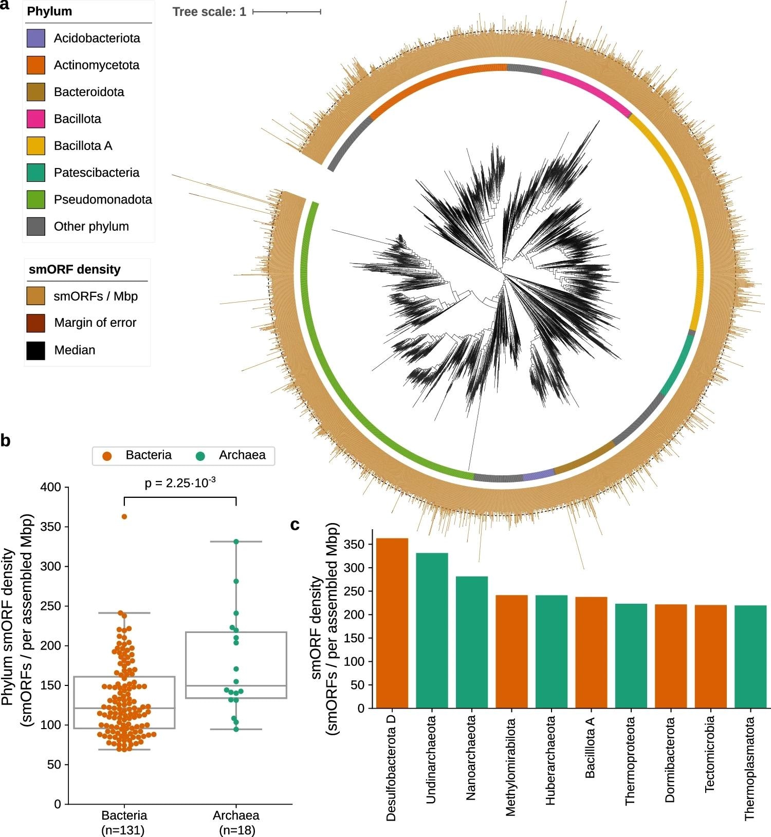GMSC-mapper-based smORF density comparisons revealed that archaea contain substantially higher proportions of smORFs than bacteria despite significantly lower sampling (18 archaeal phyla versus 131 bacterial phyla). This discovery raises intriguing questions about small proteins' functional diversity and evolutionary significance in archaea. Unfortunately, given the limitations of the current archaeal metagenomic literature, predictions of the biological functions of smORFs in these lifeforms could not be sufficiently verified.