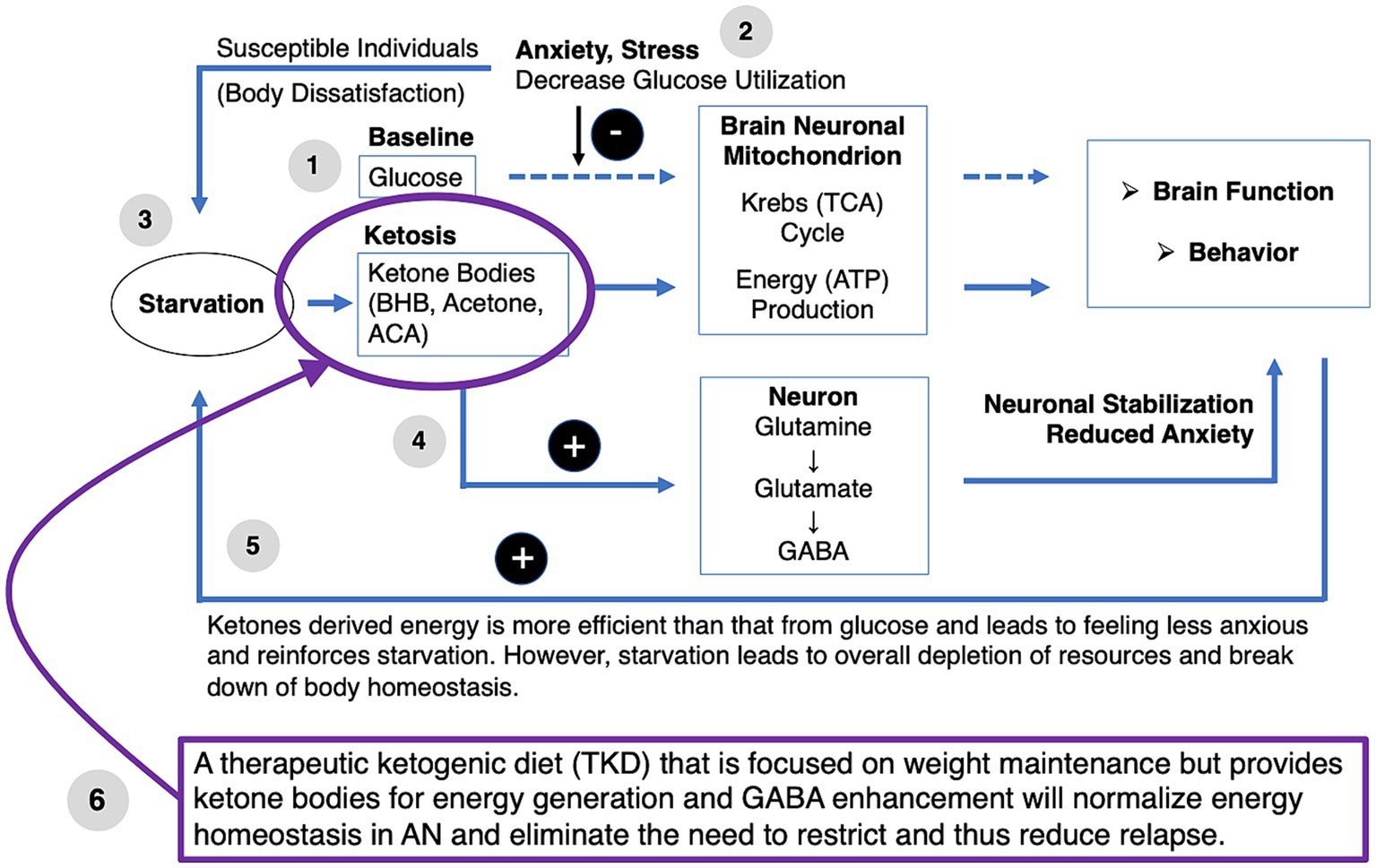 Further, upon weight recovery in people with AN (wrAN), fears of body dissatisfaction, body image distortion, and weight gain are elevated, which may persist for years. The neural mechanisms underlying self-starvation are unclear. Therefore, understanding the core behaviors in AN and wrAN can help develop effective therapies. The present study proposed a neurobiological model supporting TKD for AN, which not only targets the metabolic alterations associated with the disorder but also addresses the psychological factors contributing to its persistence and severity.
