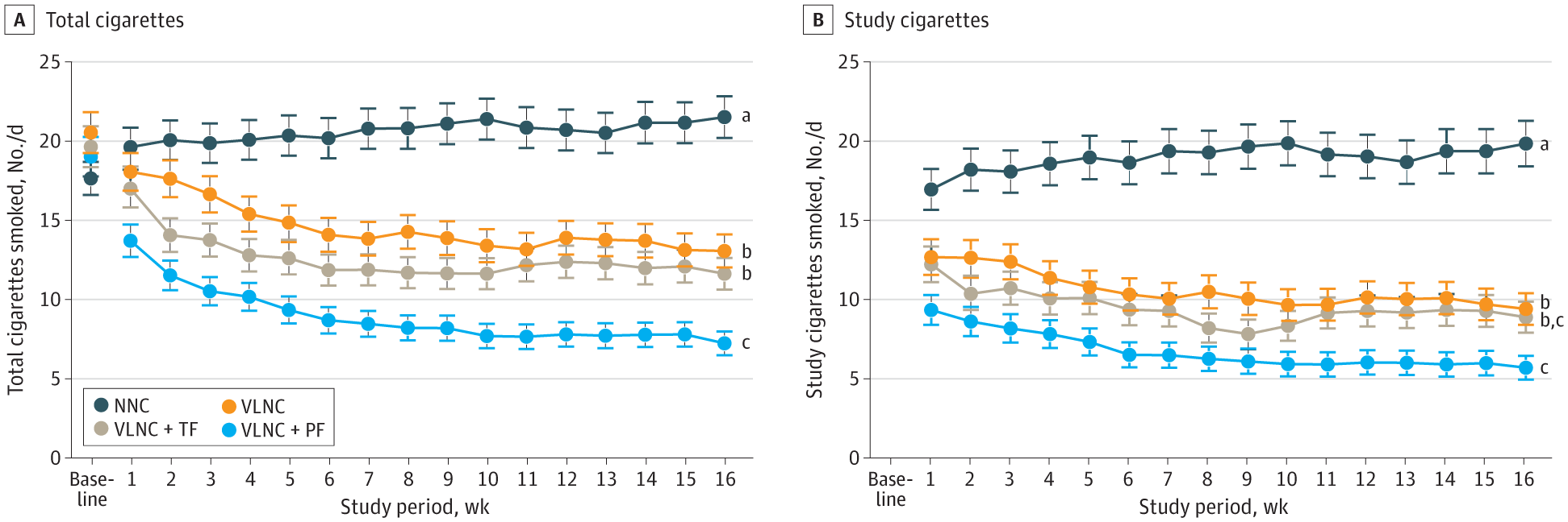 Regarding tobacco-related biomarkers, significantly lower levels of breath carbon monoxide, urine tobacco-specific carcinogen, and urine anatabine were observed in participants who received cigarettes with very low nicotine content plus e-cigarettes with their preferred flavors.