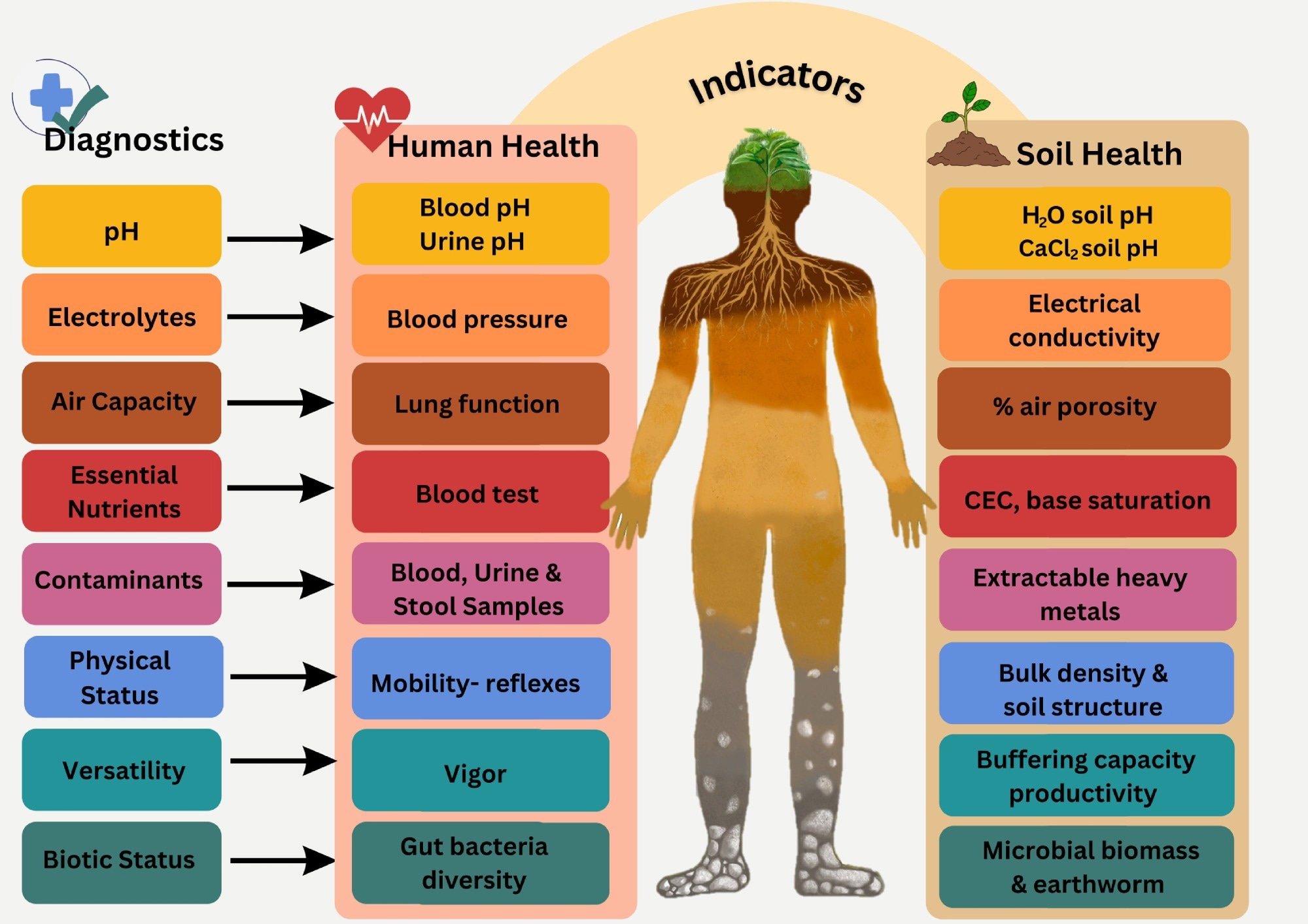 The present review aims to collate and synthesize historical and current knowledge on soil's importance in terms of the associations between its use/management and global food/human health outcomes. It employs a novel framework in which human health is used as an analogy for soil health. The review underscores the need for baseline evaluations of 'normal' soil functioning and highlights the need for symptomatic indicators that suggest declining soil health. For example, just as human illness might be diagnosed through symptoms like fatigue or pain, declining soil health can be identified through indicators like reduced microbial activity, increased compaction, or erosion. This would allow for the development of management interventions to restore soil to its normal baseline, analogous to clinical interventions against unhealthy symptoms in humans.