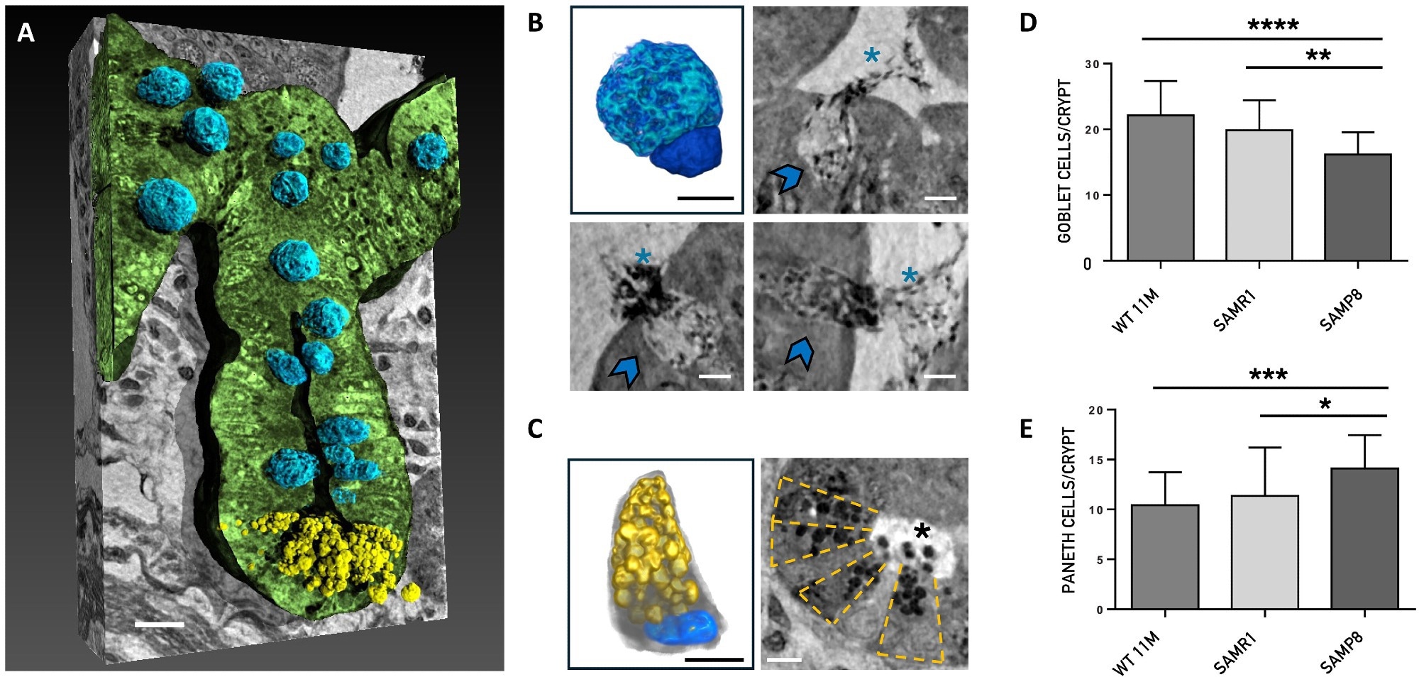 Nano-XPCT analysis of the Paneth and goblet cells. (A) Representative 3D rendering of the longitudinal view of one crypt of SAMR1 mouse. The epithelial layer of the crypt has been rendered in green. The Paneth cells are colored in yellow and the goblet cells in blue. Scale bars, 5 μm. (B) and (C) show 3D renderings and nano-XPCT close-ups of goblet and Paneth cells, respectively. The same color code of (A) has been used for the 3D renderings shown in (B) and (C). In detail, the goblet cell nucleus is colored in dark blue and the apical portion, expanded with mucin-secreting granules, which extends into the intestinal lumen, is rendered in light blue. The Paneth cell presents the typical pyramidal shape with basally situated nucleus (blue) and prominent apical granules (yellow) that occupy most of its cytoplasmatic region. Nano-XPCT close-ups in (B) show goblet cells (indicated by arrows) secreting mucus (asterisks) in the intestinal lumen. Scale bars, 2.5 μm. In (C), transversal view of a crypt in which the Paneth cells are arranged in a radial pattern (highlighted by the dashed-line boxes). The release of the antimicrobial granules (black dots, asterisk) into the lumen is visible. Scale bars, 5 μm. (D and E) Quantification of goblet and Paneth cells in the crypts. Results are obtained on 30 crypt per mouse (n = 1) and are shown as mean ± SD. One-way ANOVA P < 0.0001; post hoc by Tukey’s post hoc test: *P < 0.02, **P < 0.01, ***P < 0.001, and ****P < 0.0001.