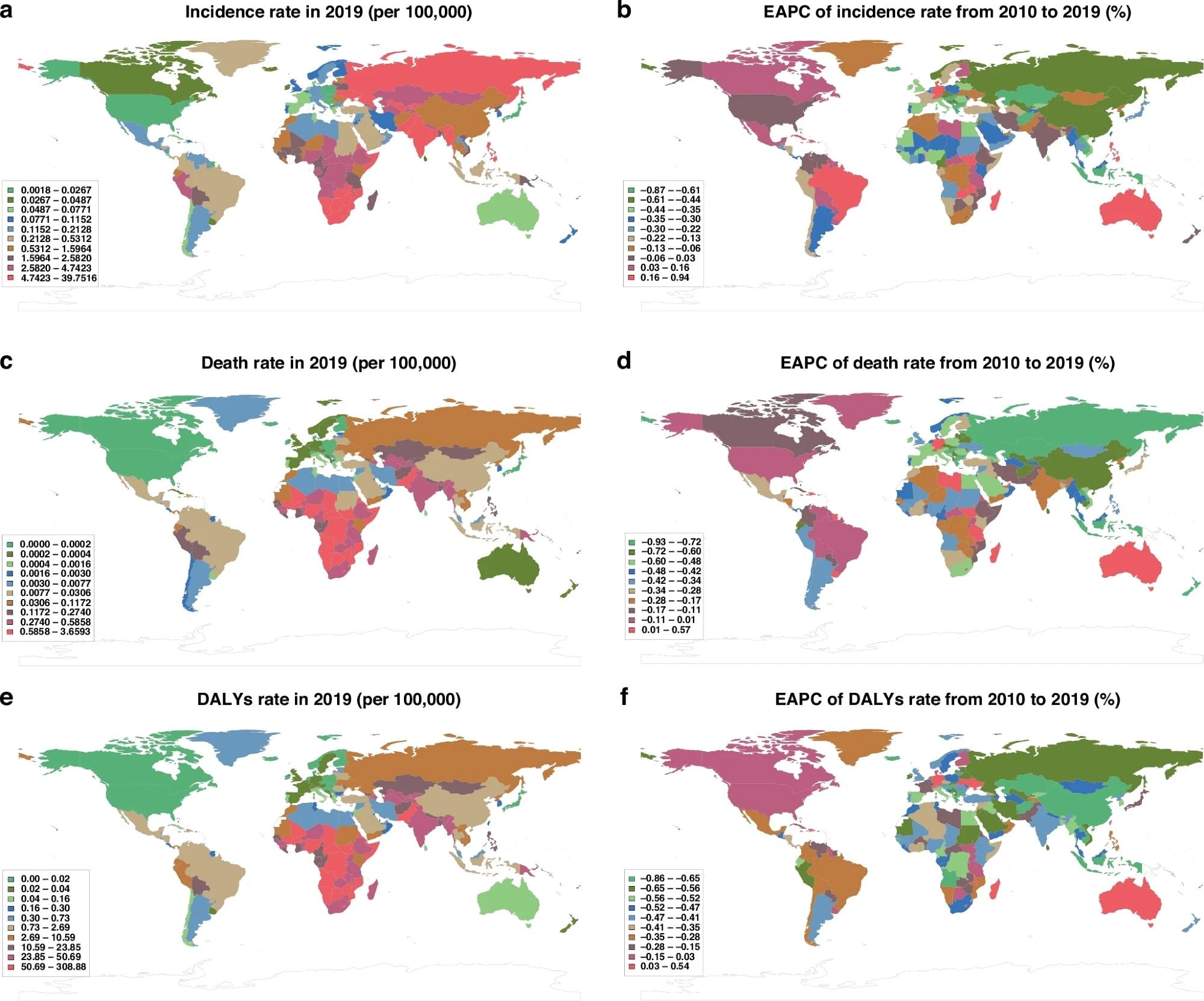 a MDR‐TB incidence rate in children and adolescents in 2019 in countries/territories; b EAPC of children and adolescents MDR‐TB incidence rate between 2010 and 2019 in countries/territories; c MDR‐TB death rate among children and adolescents afflicted with the disease in 2019. d EAPC of children and adolescents with MDR‐TB incidence rate between 2010 and 2019. e MDR‐TB DALY rate among children and adolescents in 2019. f EAPC of MDR‐TB DALYs rate among children and adolescents with the disease between 2010 and 2019. MDR‐TB multidrug-resistant tuberculosis; EAPC estimated annual percentage change; DALY disability-adjusted life year].a MDR‐TB incidence rate in children and adolescents in 2019 in countries/territories; b EAPC of children and adolescents MDR‐TB incidence rate between 2010 and 2019 in countries/territories; c MDR‐TB death rate among children and adolescents afflicted with the disease in 2019. d EAPC of children and adolescents with MDR‐TB incidence rate between 2010 and 2019. e MDR‐TB DALY rate among children and adolescents in 2019. f EAPC of MDR‐TB DALYs rate among children and adolescents with the disease between 2010 and 2019. MDR‐TB multidrug-resistant tuberculosis; EAPC estimated annual percentage change; DALY disability-adjusted life year].