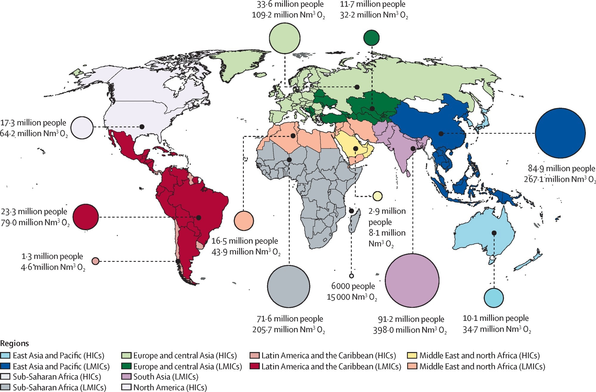 Location of people with acute medical and surgical oxygen needs in 2021, and minimum volume of oxygen required to meet need, by World Bank region Note that this figure excludes oxygen requirements related to COVID-19. Oxygen need is represented by the circles, the sizes of which are proportional to the number of people in that region who need medical oxygen therapy. Minimum volume of oxygen required to meet need was calculated using data for recommended and usual flow rates and duration for various conditions and assumes no inefficiencies in oxygen use and no wastage or inefficiencies in upstream oxygen production, supply, and distribution. HICs=high-income countries. LMICs=low-income and middle-income countries. Nm3=normal cubic metres.