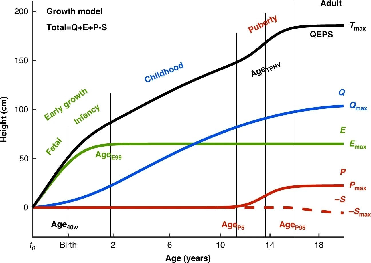 "The QEPS growth model was used to describe individual length/height growth from birth to adult height, defining an individual's growth as a combination of four distinct mathematical functions; a Quadratic (Q) function, for the basic ongoing growth starting from early fetal life until the end of growth, stopped by a Stop (S) function, a negative Exponential (E) function, specific for growth during fetal life and infancy, and a non-linear Pubertal (P) function specific for pubertal growth."