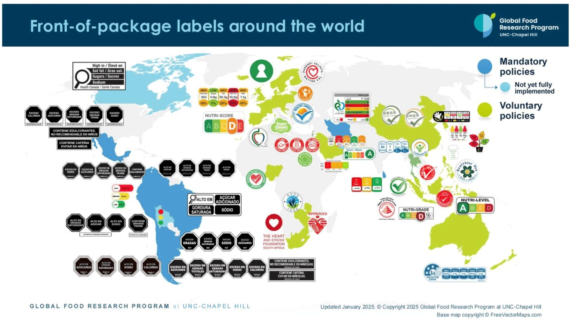 Front-of-package labels around the world. Reprinted with permission from the Global Research Program at UNC-Chapel Hill.Front-of-package labels around the world. Reprinted with permission from the Global Research Program at UNC-Chapel Hill.