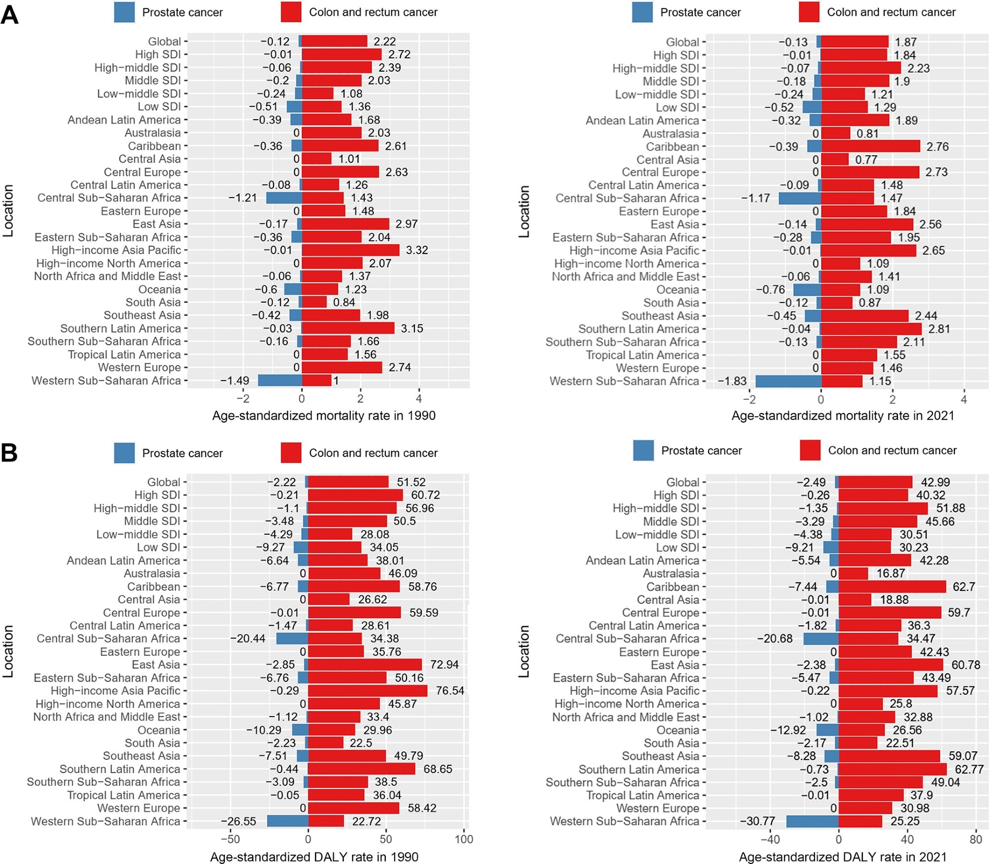 Regionally, Southern Latin America had the highest CRC ASMR and ASDR in 2021, followed by the Caribbean. Central Asia had the lowest ASMR, and Australasia had the lowest ASDR. For prostate cancer, Western Sub-Saharan Africa and Central Sub-Saharan Africa had the highest ASMRs and ASDRs. Most cancer deaths and DALYs were concentrated in East Asia in 2021.