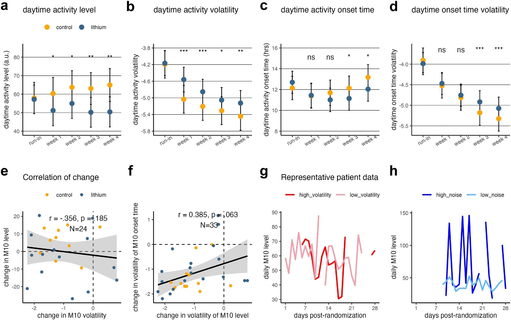 Results of the mixed linear model, for M10 level (top panel) and M10 onset time (middle panel) respectively (N = 34). (a) Daytime activity level as a function of week and group assignment. (b) Daytime activity volatility as a function of time and group assignment. (c) Daytime activity onset time as a function of week and group assignment. (d) Daytime activity onset time volatility as a function of week and group assignment. (e) The change in M10 level from pre-randomisation baseline to week 4 was not associated with the change in the change in the volatility of M10 level. (f) The change in volatility of M10 level from pre-randomisation baseline to week 4 was marginally significantly associated with the change in volatility of the M10 onset time (p = 0.06, linear mixed model). Panel F has more data points than panel E because the Bayesian filter still renders variability estimates when missing data is present. (g, h) Representative actigraphy data from a participant with higher versus low volatility (g) and high versus low noise (h). Note. The error bars in a–d indicate the 95% confidence interval; importantly, the overlap of the 95% CI of the two groups does not necessarily imply non-significance. The asterisks indicate significance level: n.s., non-significant; ∗p < 0.05, ∗∗p < 0.01; ∗∗∗p < 0.001.Results of the mixed linear model, for M10 level (top panel) and M10 onset time (middle panel) respectively (N = 34). (a) Daytime activity level as a function of week and group assignment. (b) Daytime activity volatility as a function of time and group assignment. (c) Daytime activity onset time as a function of week and group assignment. (d) Daytime activity onset time volatility as a function of week and group assignment. (e) The change in M10 level from pre-randomisation baseline to week 4 was not associated with the change in the change in the volatility of M10 level. (f) The change in volatility of M10 level from pre-randomisation baseline to week 4 was marginally significantly associated with the change in volatility of the M10 onset time (p = 0.06, linear mixed model). Panel F has more data points than panel E because the Bayesian filter still renders variability estimates when missing data is present. (g, h) Representative actigraphy data from a participant with higher versus low volatility (g) and high versus low noise (h). Note. The error bars in a–d indicate the 95% confidence interval; importantly, the overlap of the 95% CI of the two groups does not necessarily imply non-significance. The asterisks indicate significance level: n.s., non-significant; ∗p < 0.05, ∗∗p < 0.01; ∗∗∗p < 0.001.