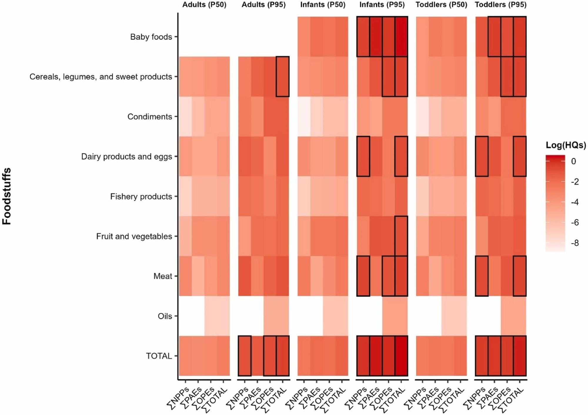Heat map of HQs in selected population groups, normalized on a logarithmic scale, considering median (P50) and 95th percentile (P95) scenarios (highlighted boxes indicate HQ values greater than 10-1).Heat map of HQs in selected population groups, normalized on a logarithmic scale, considering median (P50) and 95th percentile (P95) scenarios (highlighted boxes indicate HQ values greater than 10-1).