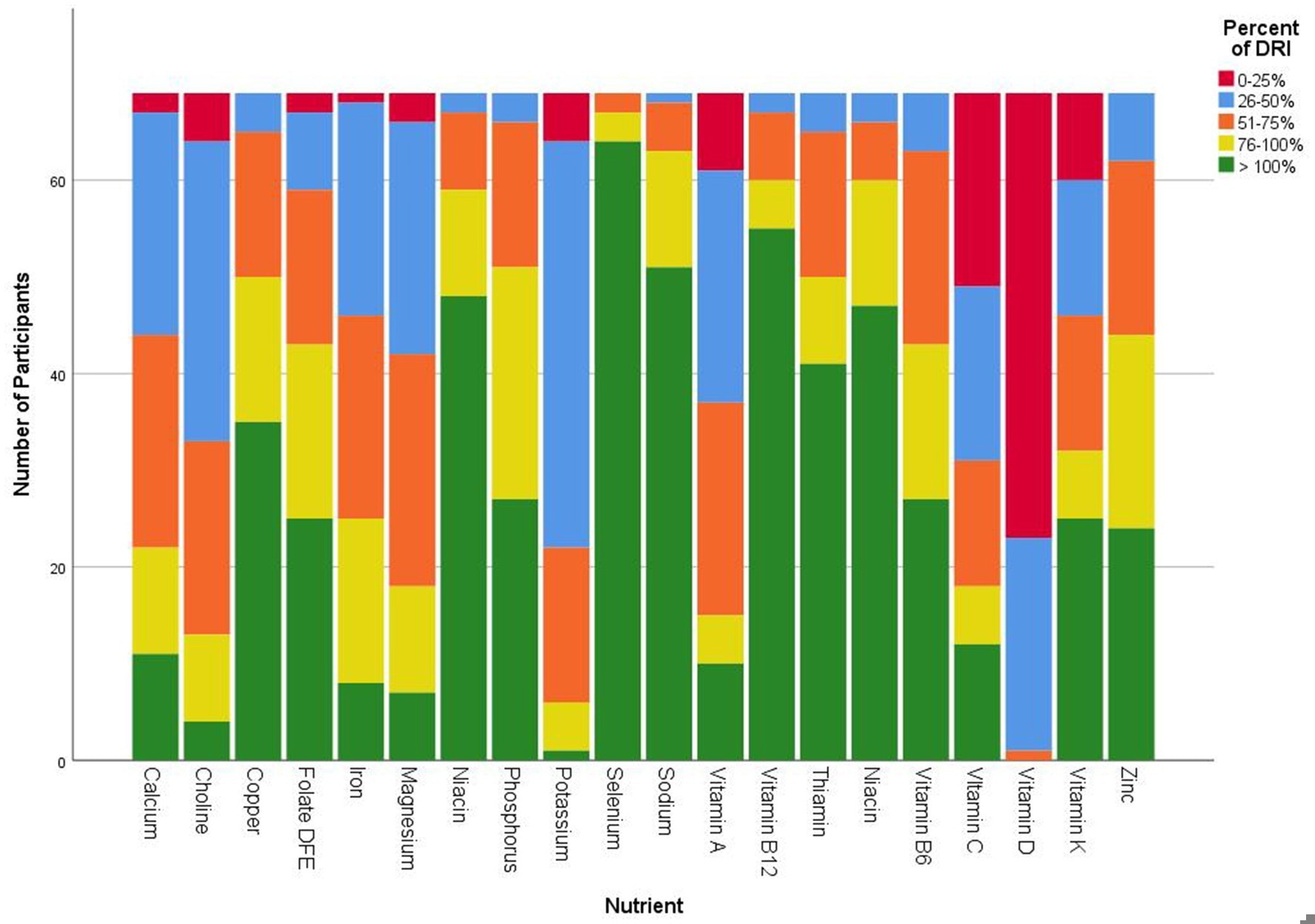 This shortfall is particularly concerning because adequate protein is crucial to preserve lean muscle mass during weight loss, a factor critical for long-term metabolic health and weight management; only 43% of participants met the lower end of this g/kg/day recommendation. By intake frequency, vitamin D, potassium, choline, magnesium, and iron had the largest deficits compared to the DRI.