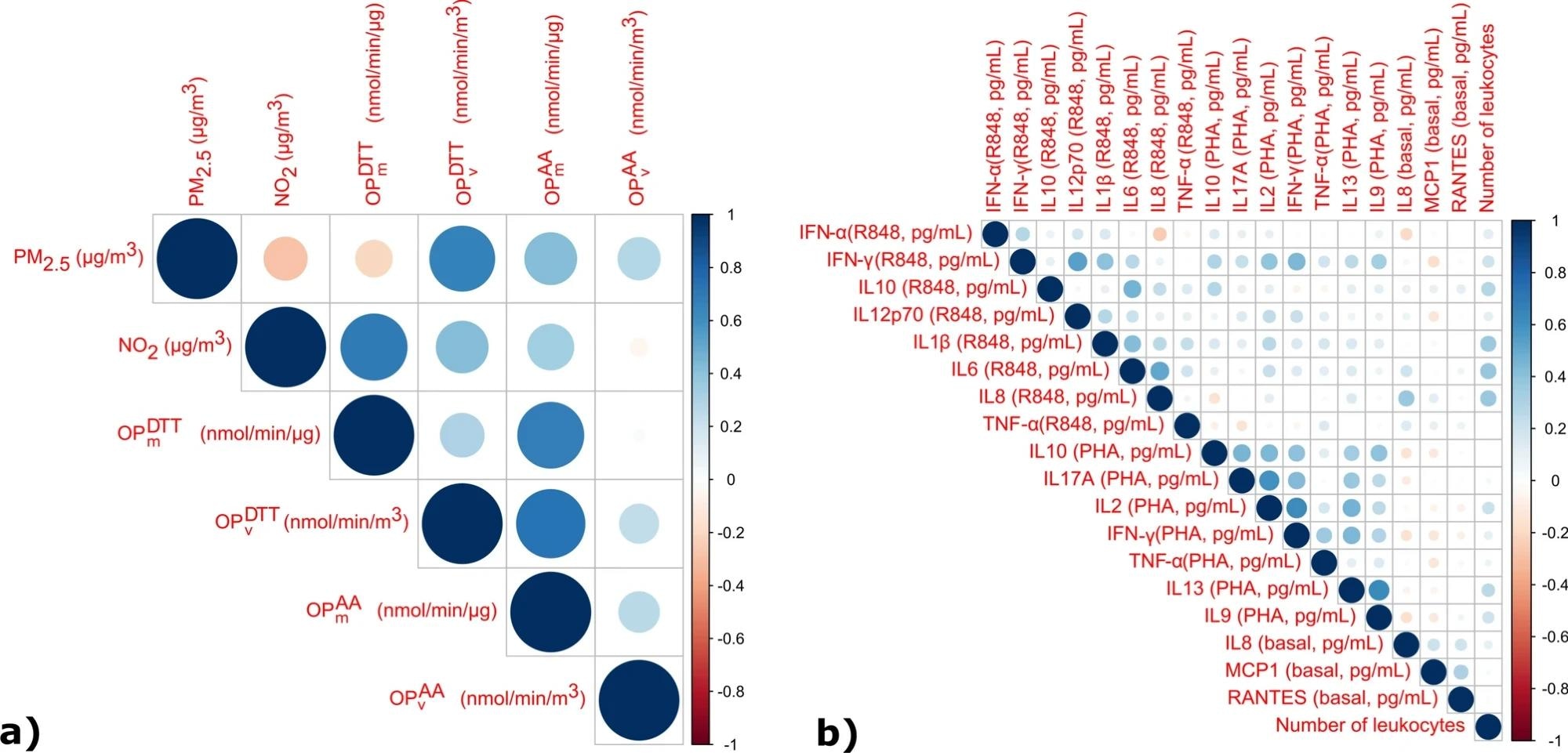 Pairwise Pearson’s correlations between air pollutants (a). Pairwise Pearson’s correlations between cytokines (imputed, corrected and log-10 transformed) and number of leukocytes (b). The Pearson correlation coefficients are indicated using a scale of size and color only when the p-values were less than 0.05. Abbreviations: PM2.5 particulate matter with diameter ≤ 2.5 μm; NO2 nitrogen dioxide; OP: oxidative potential; DTT: dithiothreitol; AA: ascorbic acid; IL interleukin; IFN interferon; TNF tumor necrosis factor; RANTES regulated on activation, normal T cell expressed and secreted; MCP monocyte chemoattractant protein; PHA phytohemagglutinin; R848 resiquimod