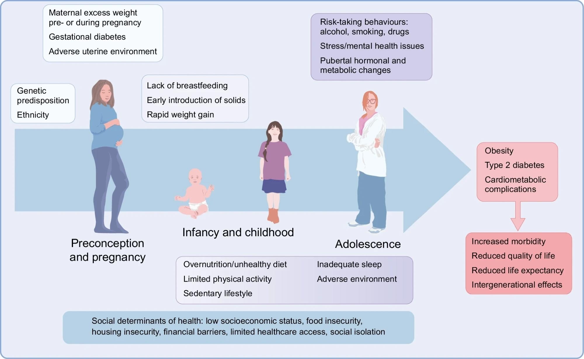 To tackle the problem at hand, interventions should begin from pre-conception and continue through adolescence. Modifiable risk factors such as diet and physical activity should be focused on. A mix of lifestyle and behavioural interventions is needed to promote long-term health.