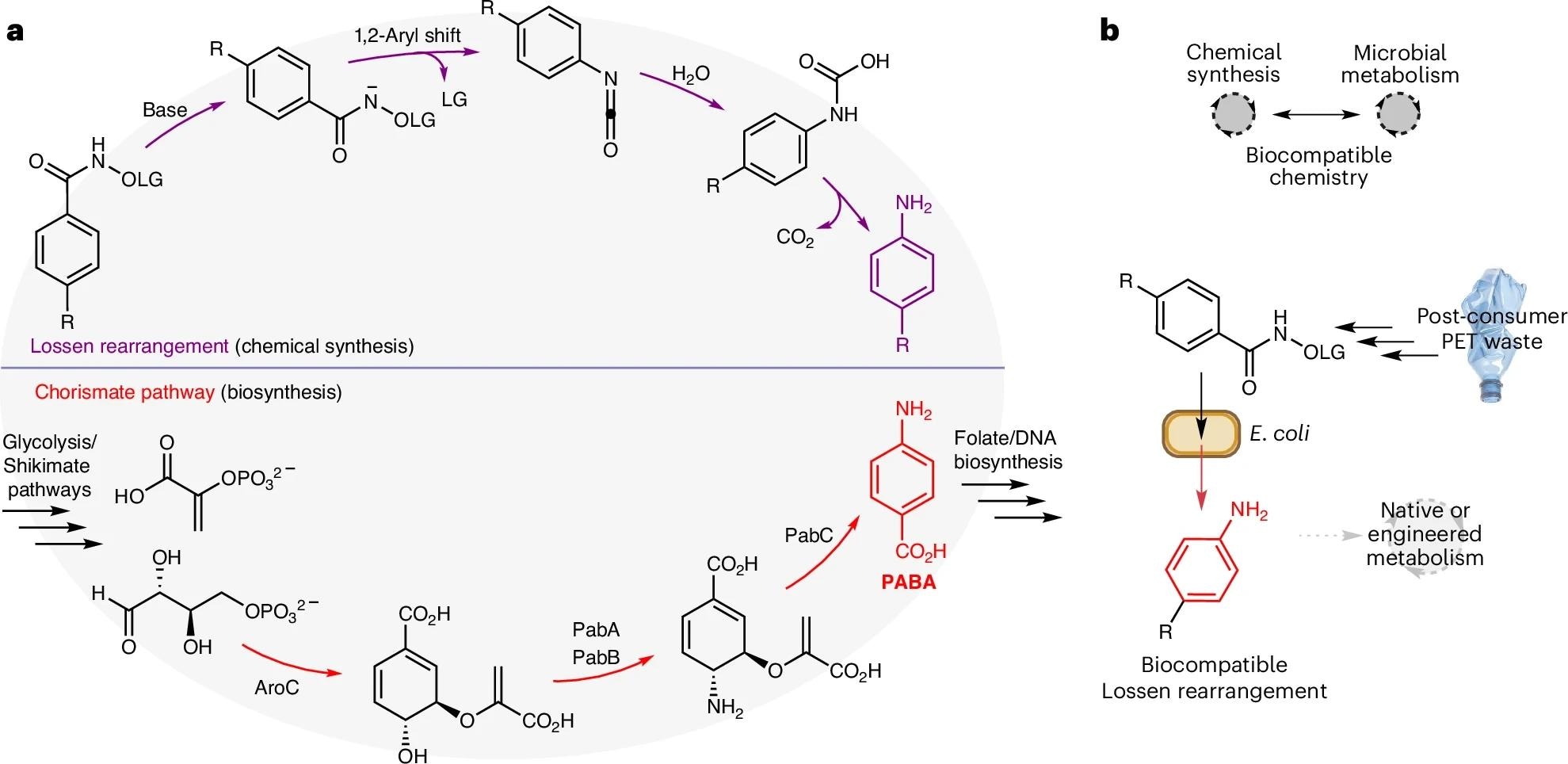 The present study highlights the potential of biocompatible chemistry research in revolutionising tomorrow's chemical production. It demonstrates a novel strain of E. coli bacteria capable of combining human ingenuity with its natural cellular machinery to achieve a Lossen rearrangement. It channels the resulting products into growth and pharmaceutical production, even from plastic (PET) waste.