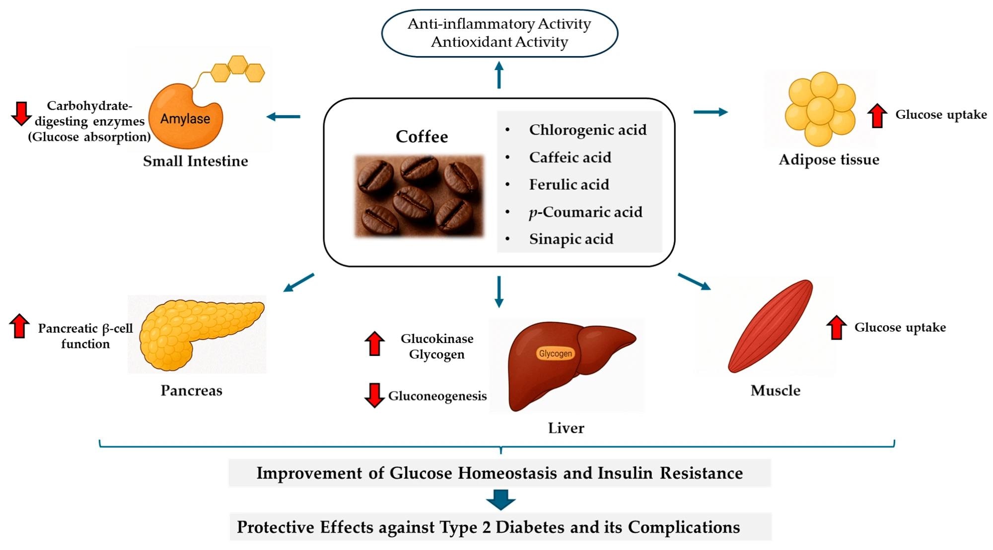 Findings reveal that coffee-derived polyphenols exhibit significant blood sugar-modulatory effects, including the suppression of inflammation, enhancement of insulin sensitivity, antioxidant properties, and improved glucose metabolism. While this evidence suggests that coffee consumption benefits T2DM, the review highlights several key knowledge gaps, including optimal dosages, bioavailability challenges, and underlying mechanisms.