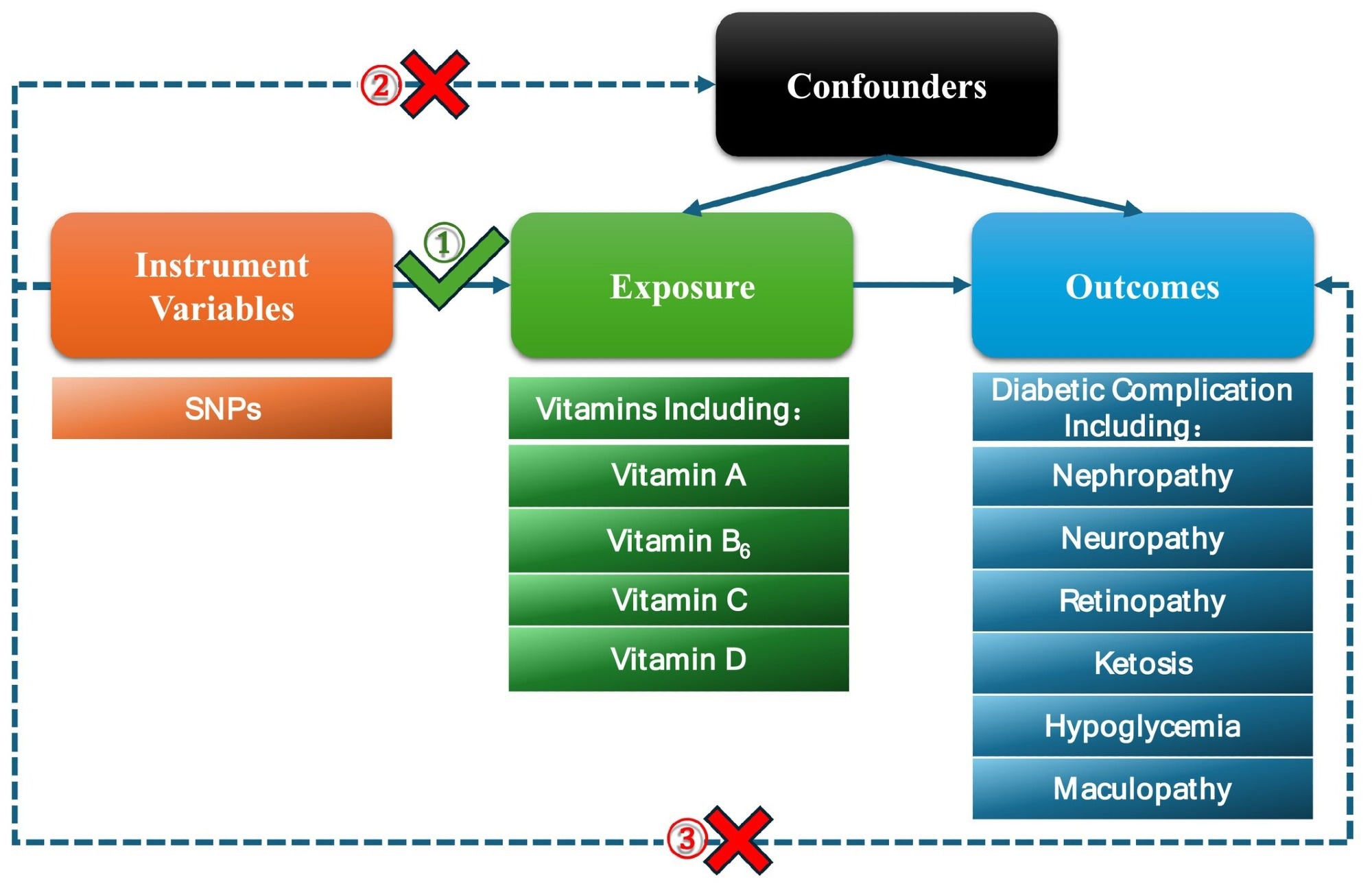 Flow chart of the Mendelian randomization (MR) study and three key assumptions. Firstly, the selected single nucleotide polymorphisms (SNPs) are strongly associated with exposure; vitamins are used as exposure factors in this article. Secondly, there is no association between the SNPs and confounders. Finally, the SNPs can only impact outcomes (diabetic complications) through vitamins directly.Flow chart of the Mendelian randomization (MR) study and three key assumptions. Firstly, the selected single nucleotide polymorphisms (SNPs) are strongly associated with exposure; vitamins are used as exposure factors in this article. Secondly, there is no association between the SNPs and confounders. Finally, the SNPs can only impact outcomes (diabetic complications) through vitamins directly.