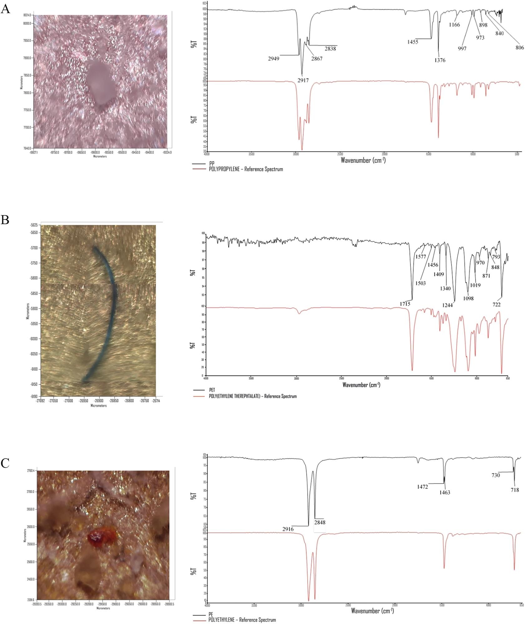 Images and Fourier-transformed infrared micro-spectroscopy in attenuated total reflectance mode analysis (μ-FTIR-ATR) spectra of three identified MP with different shapes and colors: A polypropylene, B poly(ethylene terephthalate), and C polyethylene (black line for MP spectra from dairy products, red line for MP spectra from reference libraries).