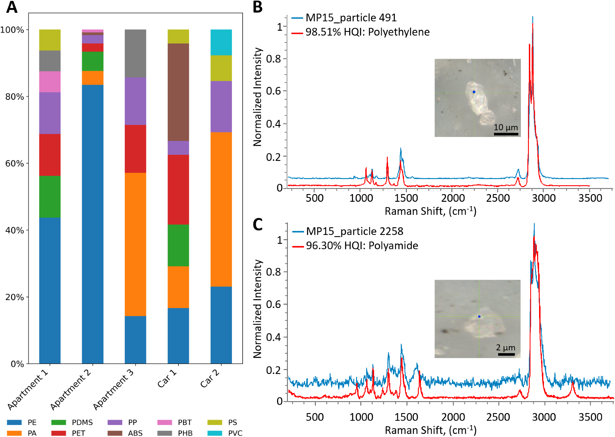 MP polymer composition in indoor environments. (A) Total suspended MP polymer composition observed in different indoor environments studied. (B) Raman spectrum of polyethylene (PE) particle (blue) and reference spectrum of PE (red). (C) Raman spectrum of polyamide (PA) particle (blue) and reference spectrum of PA (red). MP polymer composition in indoor environments. (A) Total suspended MP polymer composition observed in different indoor environments studied. (B) Raman spectrum of polyethylene (PE) particle (blue) and reference spectrum of PE (red). (C) Raman spectrum of polyamide (PA) particle (blue) and reference spectrum of PA (red).