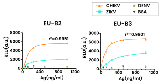 Figure 2. Detection of serially diluted (0-1000 ng/mL) recombinant CHIKV-E2 (Sino Biological, 40440-V08B), ZIKA-E (Sino Biological, 40543-V08B4), DENV-E (Sino Biological, 40471-V08B) proteins using peptide aptamers B2 and B3 10. Image Credit: Sino Biological Inc​​​​​​​