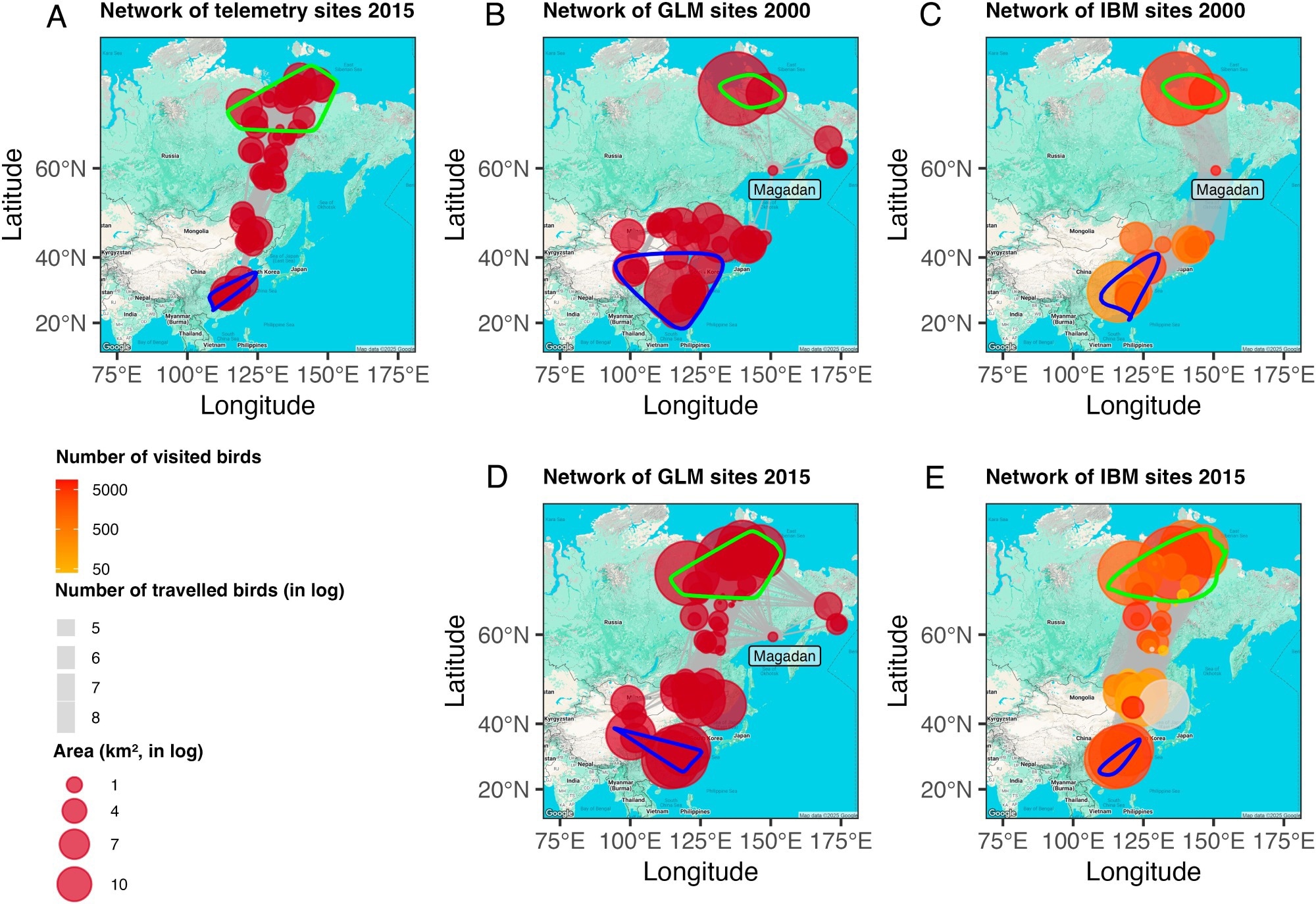 Migration networks generated from telemetry tracking, GLM predictions, and IBM simulations for 2000 and 2015 scenarios. (A) Network of sites from dBBMM using 2015 telemetry tracking data; (B) Network of sites predicted by GLM for 2000; (C) Network based on sites simulated by IBM for 2000; (D) Network of sites predicted by GLM for 2015; (E) Network based on sites simulated by IBM for 2015. Links in networks A, B, and D use migration step length, whereas links in networks C and E use simulated IBM movement trajectories. Green and blue contours show breeding and wintering ground ranges, respectively. In networks C and E, node color indicates number of visited birds, and link width indicates number of traveling birds.Migration networks generated from telemetry tracking, GLM predictions, and IBM simulations for 2000 and 2015 scenarios. (A) Network of sites from dBBMM using 2015 telemetry tracking data; (B) Network of sites predicted by GLM for 2000; (C) Network based on sites simulated by IBM for 2000; (D) Network of sites predicted by GLM for 2015; (E) Network based on sites simulated by IBM for 2015. Links in networks A, B, and D use migration step length, whereas links in networks C and E use simulated IBM movement trajectories. Green and blue contours show breeding and wintering ground ranges, respectively. In networks C and E, node color indicates the number of visited birds, and link width indicates the number of traveling birds.