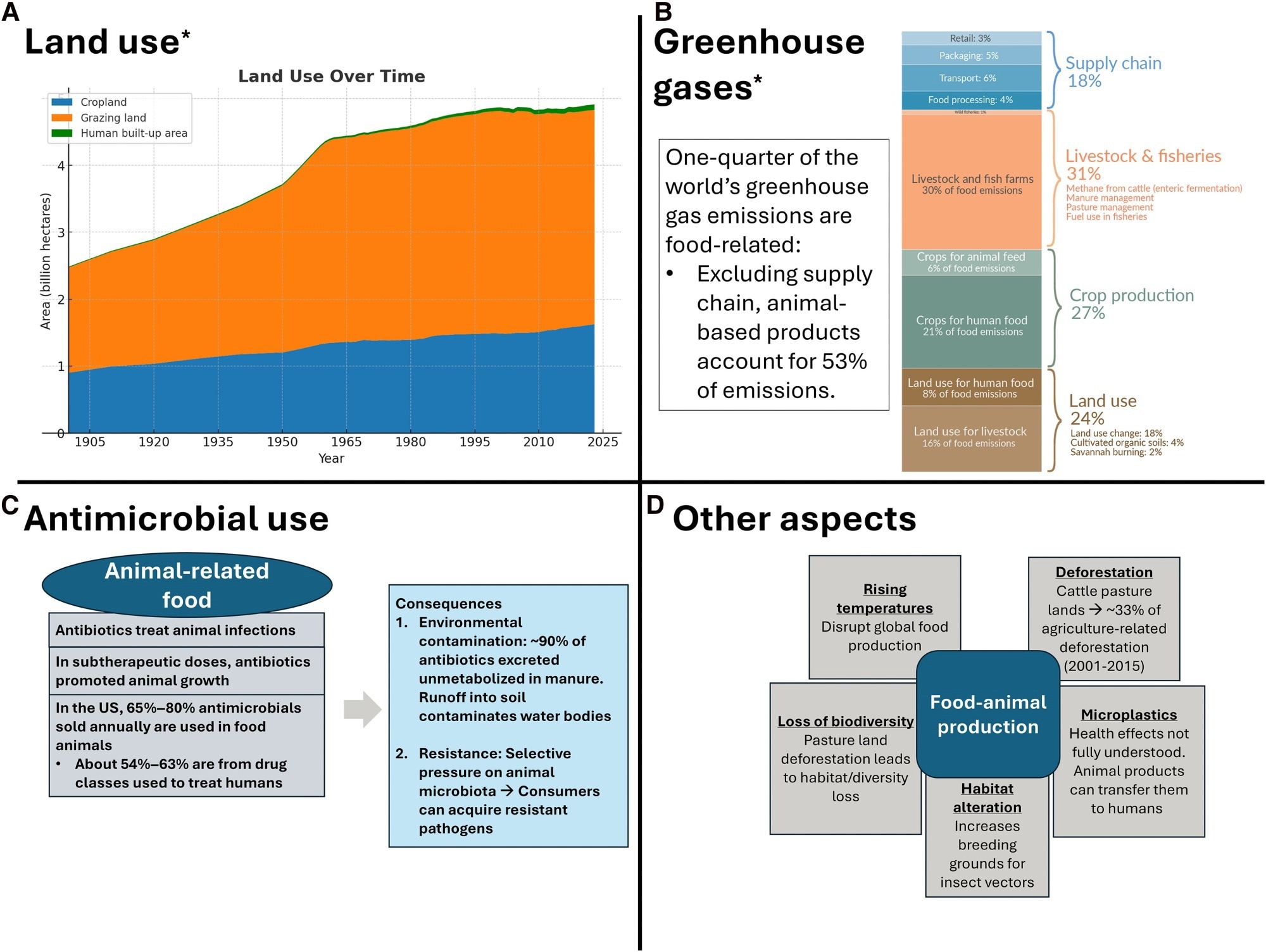 Environmental consequences of dietary animal products. A, Graphical reflection of global land use over the past 120 years. B, Breakdown of greenhouse gas emissions related to food production. C, Consequences of antibiotic use in animal agriculture. D, Other negative consequences of animal-based food production. By authors Hannah Richie and Max Roser licensed under Creative Commons License CC-BY.
