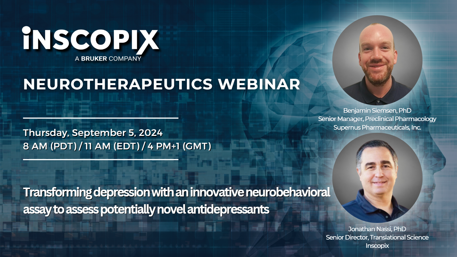 Dr. Benjamin Siemsen of Supernus Pharmaceuticals, Inc. unveil the newest findings from a project conducted through the Inscopix Discovery Lab, in a presentation titled, “NV-5138 screening through Inscopix neurobehavioral assay: Comparison with ketamine and rapastinel”.