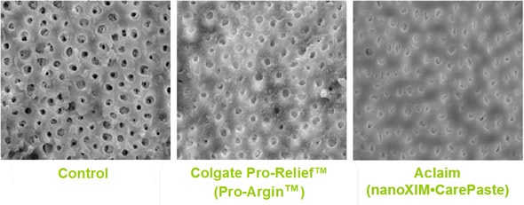 To test the rates of dentin tubule occlusion, another in vitro study compared a dentifrice containing nanoXIM•CarePaste with Colgate Pro-ReliefTM Pro-ArginTM technology.