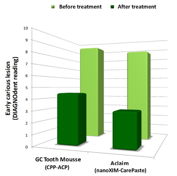For the study, carious lesions were created in teeth by exposing them to demineralizing solution for 96 hours. The teeth were then treated using the two different dentifrices. The carious lesions were assessed using a diode laser fluorescence device called the DIAGNOdent Pen. The lower the value displayed by the DIAGNOdent pen, the greater the remineralization of the carious lesion. Figure 5 shows that nanoXIM•CarePaste was significantly more effective at remineralizing the lesion than the CPP-ACP dentifrice.