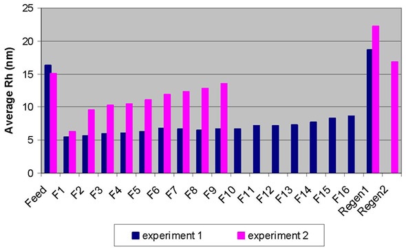 The quantified Rh value of the regeneration sample is 18.6 nm, which is greater than the value of the feed sample, at 16.3 nm, which suggest that the HMW population is higher than in the feed sample. The plotting of the percentage of aggregates obtained by SEC-MALS against the average Rh ascertained by DLS (Figure 1) showed an excellent correlation for the flow-through fractions.
