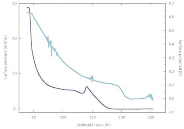 The drug’s monolayer properties and its interactions with the monolayers of DPPC were examined using a KSV NIMA Langmuir Trough equipped with KSV NIMA SPOT surface potential meter, as well as a KSV polarization modulation surface infrared reflection absorption spectrometer (NIMA PM-IRRAS). In addition, Brewster angle microscopy and surface elasticity analyses were performed using the system.