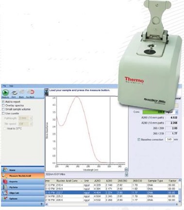 The NanoDrop 2000™ (Figure 1) is able to measure a sample using just 1μl of sample and in less than five seconds. This instrument is connected to a computer and the results are recorded using software that can be either printed or exported as a report.