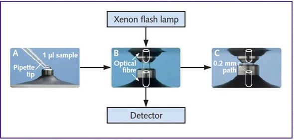 Figure 2. Fluorescence measurements using the NanoDrop 2000™. Sample is pipetted directly onto the pedestal (A). Once the arm is closed a sample column is formed between the xenon flash lamp and detector (B). The pedestal then moves to automatically adjust for optimal path length and absorbance readings are captured through the optical fibre by the detector (C).