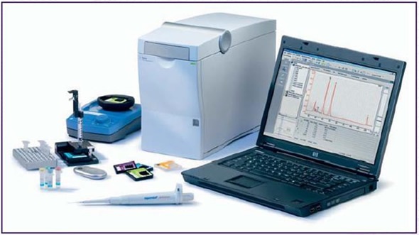 Figure 4. The Agilent 2100 Bioanalyzer© and high-sensitivity DNA assay components. Beside the instrument, a vortex and chip priming station are used to prepare samples for analysis. The 2100 work area software has several tabs which display data for evaluation of chip runs that can be presented as result tables, gel-like images, histograms, dot plots, or, as above, electropherograms.