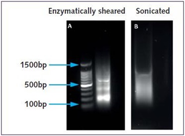 In the case of chromatin prepared through sonication, subsequent to cell membrane lysis, a suitable amount of Lysis Buffer was used to release nuclei and the isolated nuclear fraction was separated using centrifugation. The chromatin was sheared to obtain suitable fragment lengths of 100 to 500bp (Figure 2).