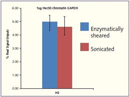 For core H3, a high real signal was achieved, which was similar to that achieved when Hec50 chromatin was prepared using the sonication process (real signal of 4.56% of H3 at the GAPDH loci). Good reproducibility has been shown, demonstrating a low variability between samples, regardless of the starting cell number (Figure 3).