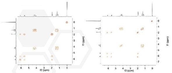 Figure 4 Left. Single scan COSY spectrum of ethyl methacrylate. Right: High resolution COSY-45 ethyl methacrylate 5 wt% in CDCl3