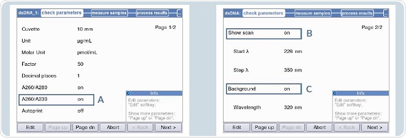 Figure 4. Settings for measurement of the primary solution in the Eppendorf Biospectrometer fluorescence A: A260/A230 B: Activation of “scan” C: Activation of background.