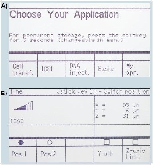 The application mask of ICSI can store about three positions. Two of these are reserved already (Pos. 1 and Pos. 2), while the third position can be programmed individually (Pos. 3). The joystick is to be pressed twice to reset the required position of the capillary (Figure 5) during the course of the ICSI process.
