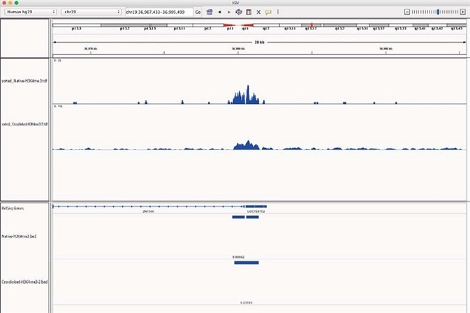When analyzing specific gene loci, additional validation of the homology between X-ChIP-seq and N-ChIP-seq is seen. Figure 5 shows that in N and X-linked ChIP samples, the ubiquitously expressed DNA binding protein ZNF566 showed comparable H3k4me3 peak enrichment above background.