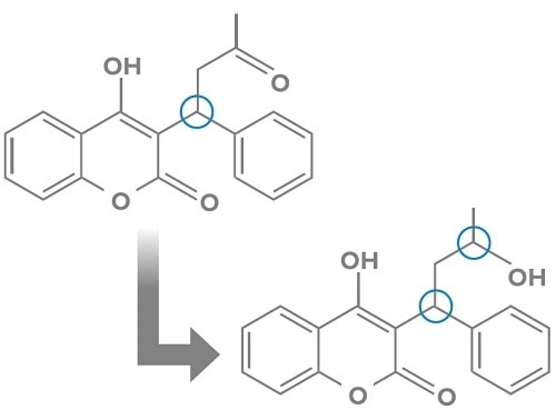 • The transformation of chiral compounds such as warfarin through keto-reduction to diastereomer compounds, in this case two pairs of diastereomer alcohols shown below: