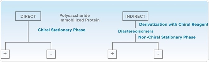 On the other hand, chiral separation methods do need particular care to develop and validate them. The method of choice is to separate enantiomers on a chiral stationary phase such as immobilized protein or a polysaccharide phase, though indirect methods are available in which derivatives of the enantiomers are created using a chiral reagent to yield diastereoisomers, which are capable of separating on traditional separation columns.