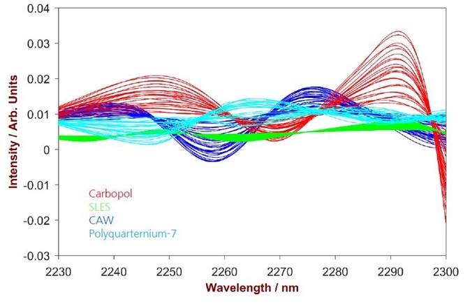 The overlay of pure SLES with the SLES-shampoo mixtures (Fig.3) highlights two key wavelength areas (1350–1800 nm and 2200–2420 nm) which were then used to develop a vigorous prediction model.
