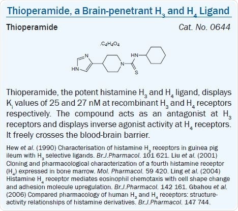 The H3 receptor agonist (R)-(–)-αmethylhistamine and the antagonist thioperamide (see figure 3) were developed shortly after.51 It was confirmed that this receptor subtype does regulate the release and synthesis of histamine and also has a regulatory role in the release of other neurotransmitters such as noradrenaline, serotonin, and dopamine.52