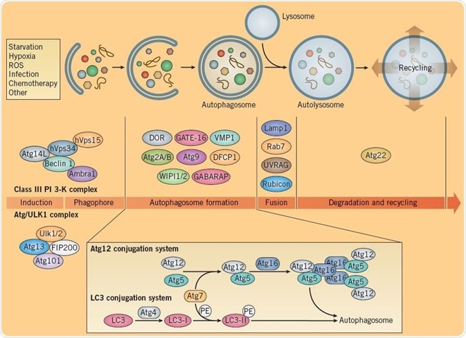 Autophagy is a cellular process performed by cells for degradation and recycling. The word autophagy refers to ‘self-eating’, thus implying the digestion occurring inside lysosomes. After digestion, the degradation products are translocated to the cytoplasm, where they are then used in the maintenance of cellular homeostasis. Regulated by the ATG proteins, autophagy is conserved from yeast to humans. In effect, it is a cellular response to starvation and stress, with its dysregulation being implicated in many pathological situations, ranging from infection to cancer and neurodegeneration.