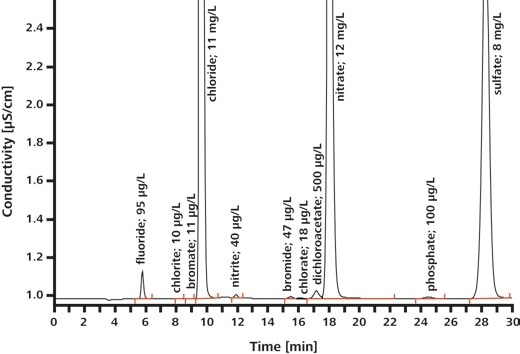 If filtration is required, this can be performed inline and fully automatically by adding an ultrafiltration cell to the IC system. EPA 300.1 stipulates the use of a guard column upstream of the separation column to protect the latter. Detection is done after suppression by utilizing a conductivity cell. A sample processor enables further automation of the analyses and enhances sample throughput, in addition to reproducibility.